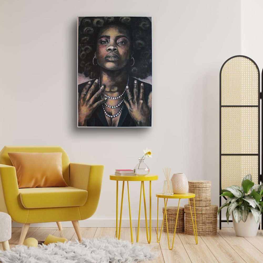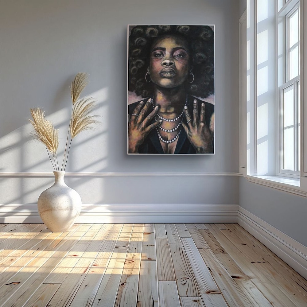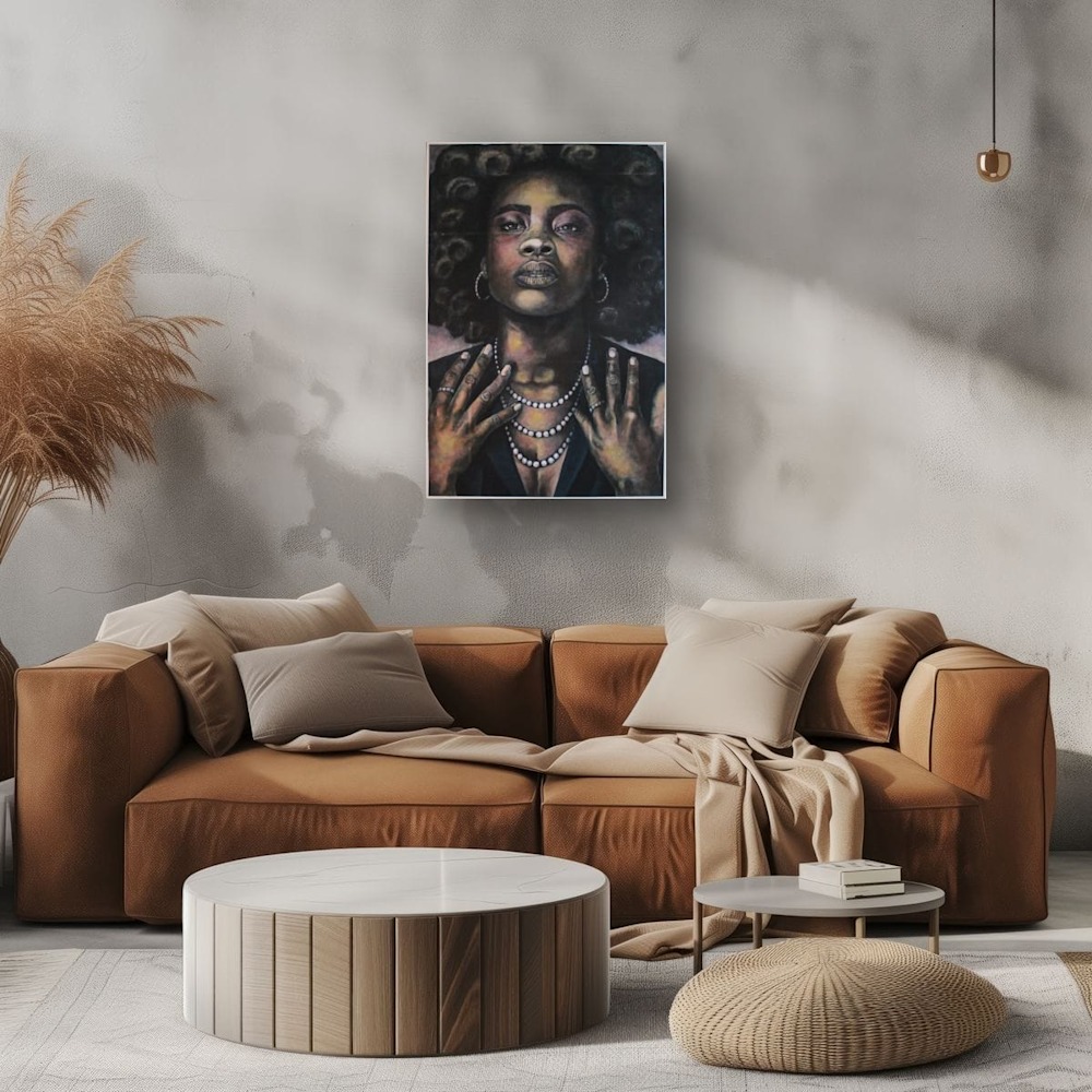 This painting is not simply observed — it is experienced. She looks outward as if aware of her legacy, aware of the space she occupies. The viewer is not allowed to diminish her; they are invited to witness her strength, her tenderness, her unapologetic existence. A centerpiece piece — bold, refined, emotionally textured — made for collectors who cherish work with voice.