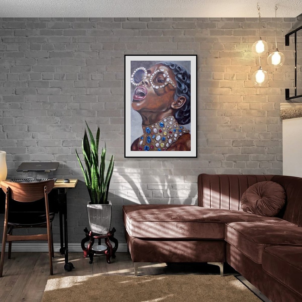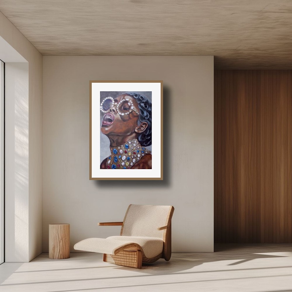 A portrait that vibrates with sound even though the canvas itself makes none. It is the moment a woman steps fully into her own brilliance — bold, radiant, and refusing to shrink.