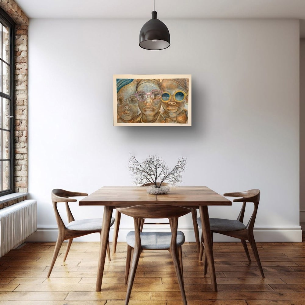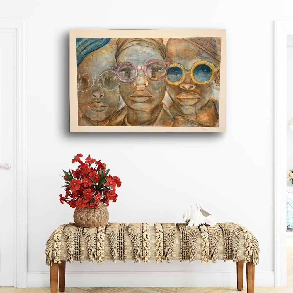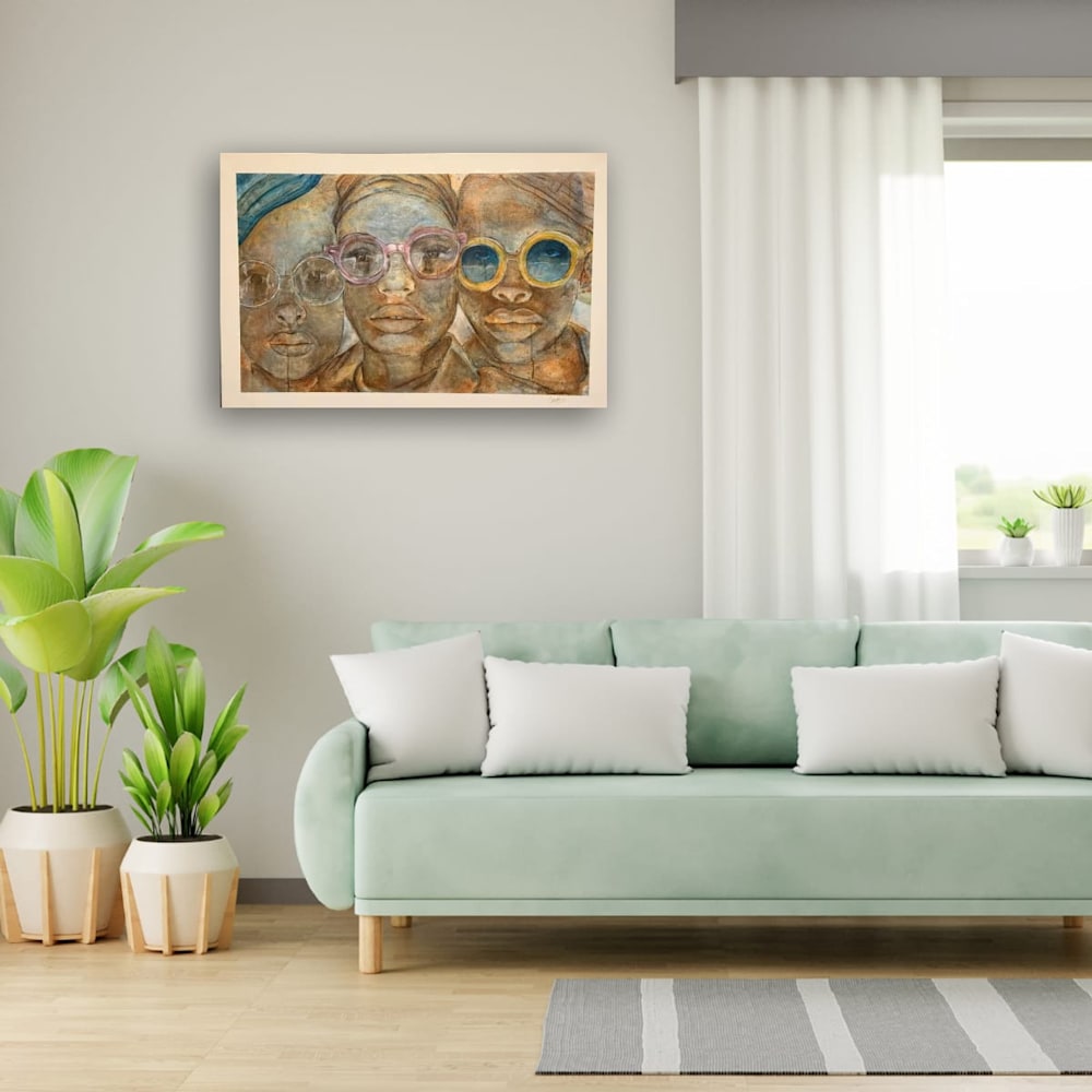 Description: “One Voice” is a bold and thought-provoking piece that features three figures adorned with vibrant, round sunglasses in shades of pink, yellow, and clear. Their expressions are both calm and intense, reflecting a sense of unity and shared purpose. The intricate textures and earthy tones combined with the soft washes of color create a harmonious yet striking composition. This painting beautifully illustrates the power of collective voices and the strength found in solidarity, echoing the universal message that we are all interconnected.