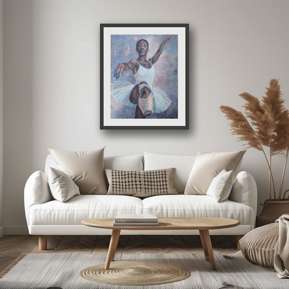 Still En Pointe is a portrait of defiance wrapped in grace — a Black ballerina suspended in a moment that is both soft and commanding. Her raised arms, her lifted chest, her steady gaze: each speaks of a woman who knows her worth even when the world tries to unwrite her.