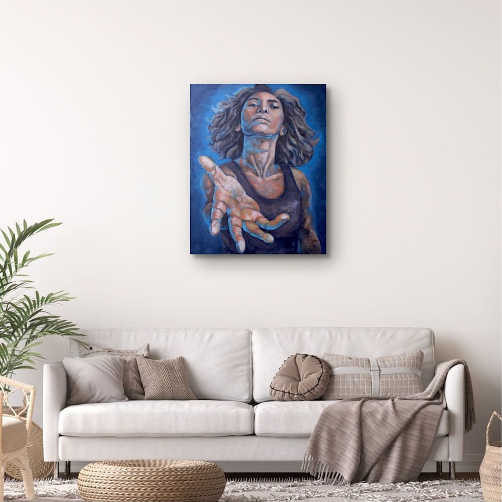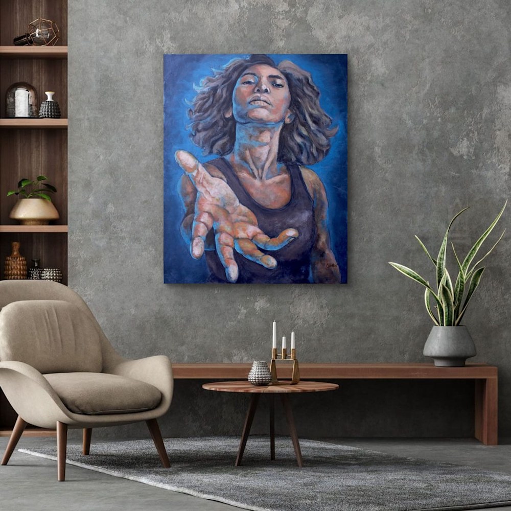 Painted from a dramatic upward perspective, the figure extends her hand toward the viewer, inviting connection and trust. Her expression rises with determination and quiet vulnerability, embodying the courage it takes to hope again. Soft color transitions and textured strokes echo the emotional terrain of renewal, creating a sense of movement, breath, and becoming.